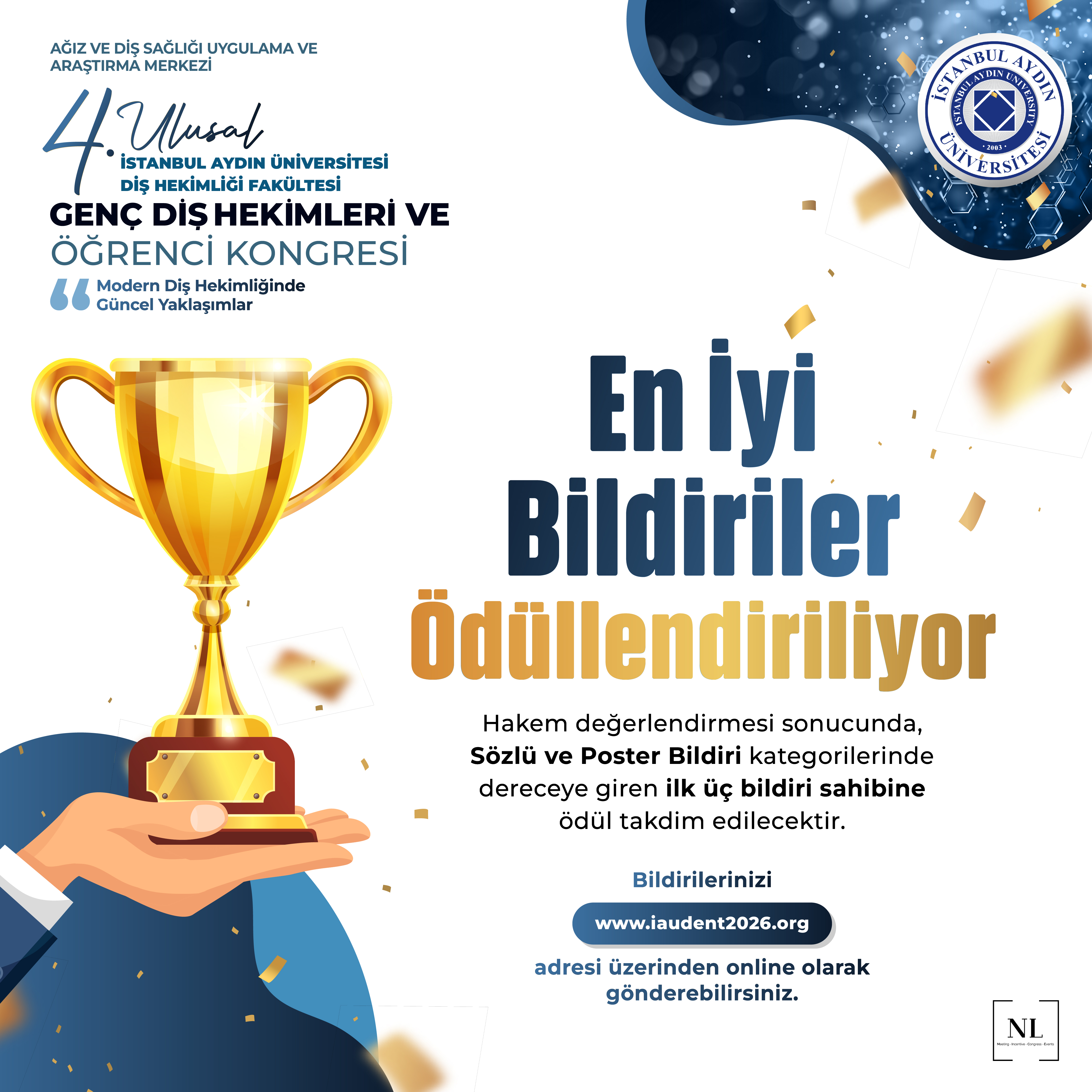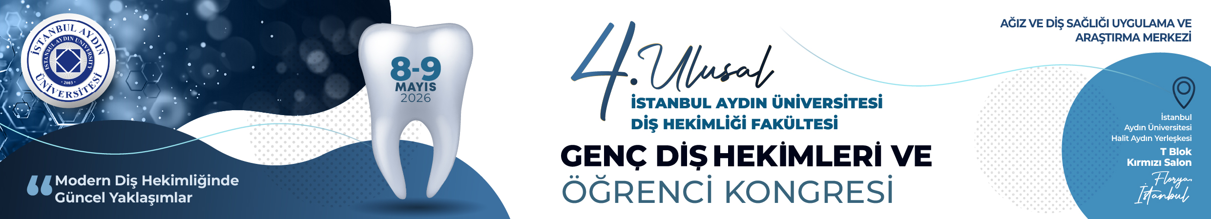 08 – 09 Mayıs 2026 tarihinde düzenleyeceğimiz 4. Ulusal İstanbul Aydın Üniversitesi Diş Hekimliği Fakültesi Genç Diş Hekimleri ve Öğrenci Kongresi’ne sizleri davet etmekten büyük mutluluk duyuyoruz. Sizlerin yoğun katılımıyla tamamlanan ilk üç kongrenin ardından dördüncü kongremizin de hem bilimsel hem de sosyal içeriklerle doyurucu bir kongre olması için hazırlıklarımız tüm hızıyla devam ediyor.